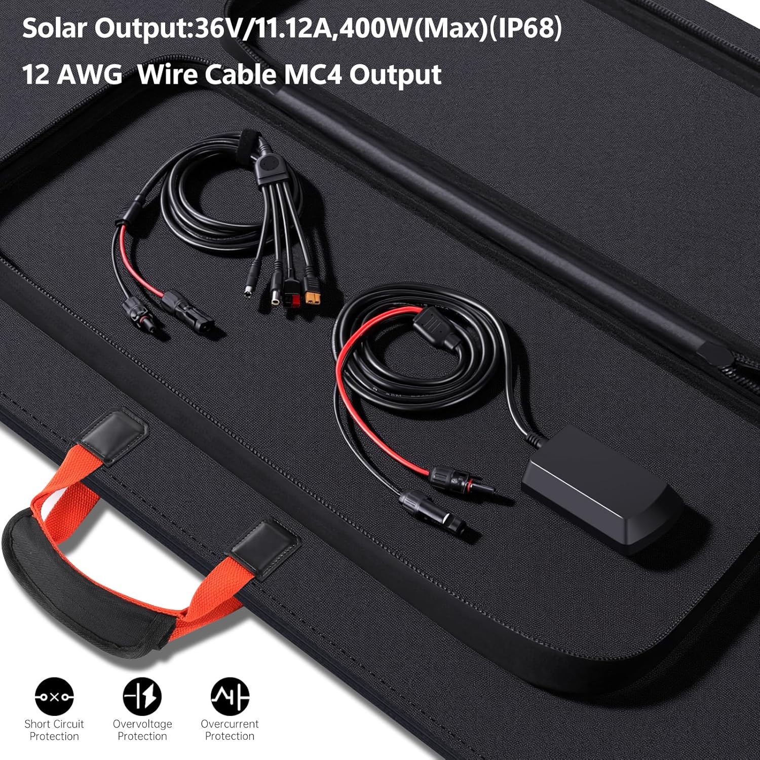 【Compatible with Most Solar Generators】 400W portable solar panel comes with MC-4 to 4-in-1 solar panel connectors (XT60,DC7909 (8mm),Anderson,DC8020mm),compatible with most solar generators/portable power stations on the market. Compatible with most solar generators/portable power stations on the market (e.g. Jackery,Ecoflow,Blutti,FlashFish,Goal Zero,Anker ,etc.)