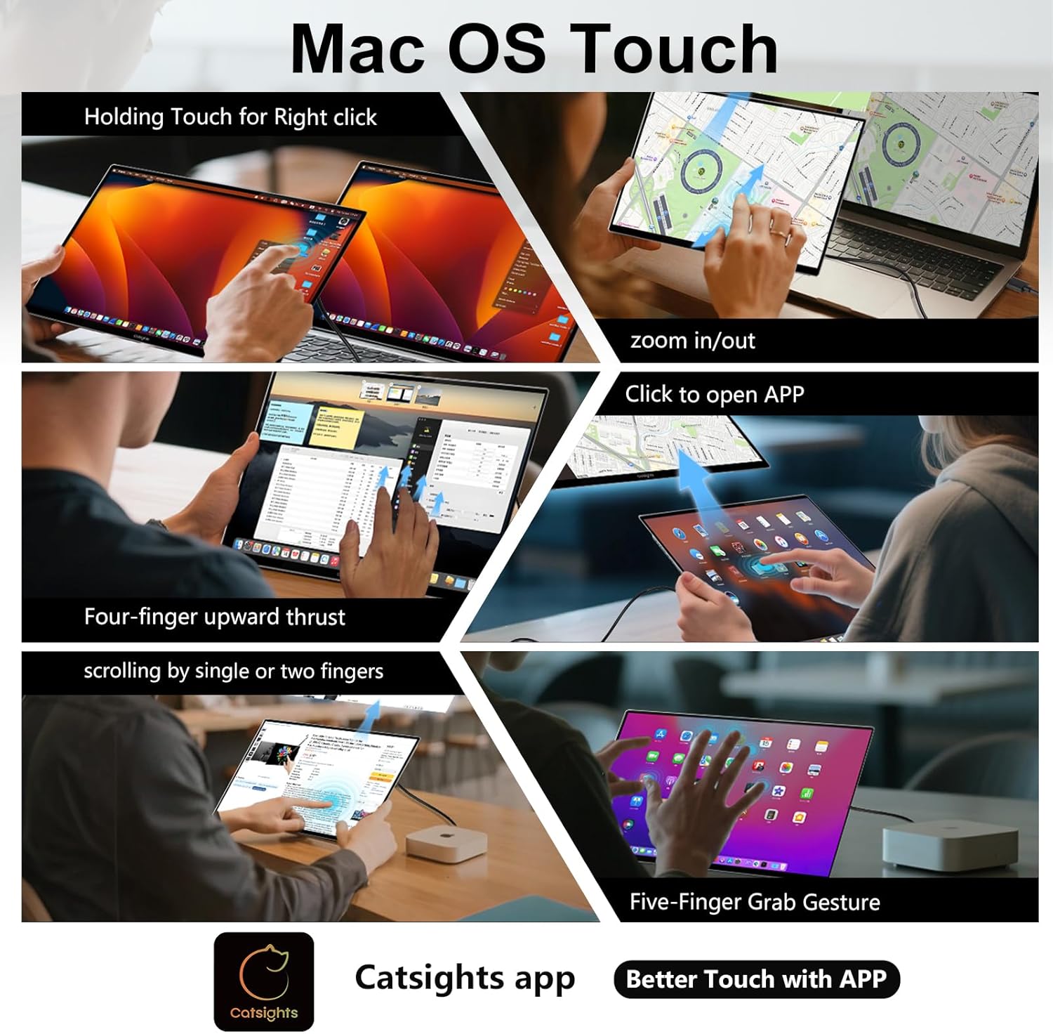【Magic Trackpad Touchscreen Portable Monitor】Catsights One S Portable Monitor is compatible with Windows/Android/iOS/MacOS. You can get touch function for your laptop, PC, ipad or MacBook by connecting via Type-C interface. Offering MacBook-level touchpad functionality, the laptop screen extender supports macOS 14.1 and later—smoother after installing the Catsights app (includes a USB drive built-in app for direct installation, or download via manual/guide image). Touchscreen monitor also supports Windows/Android/iOS/iPad devices without app installation (𝐍𝐨𝐭𝐞: Only supports iPhone 15 and later, and only iPads using the M-series kernel).