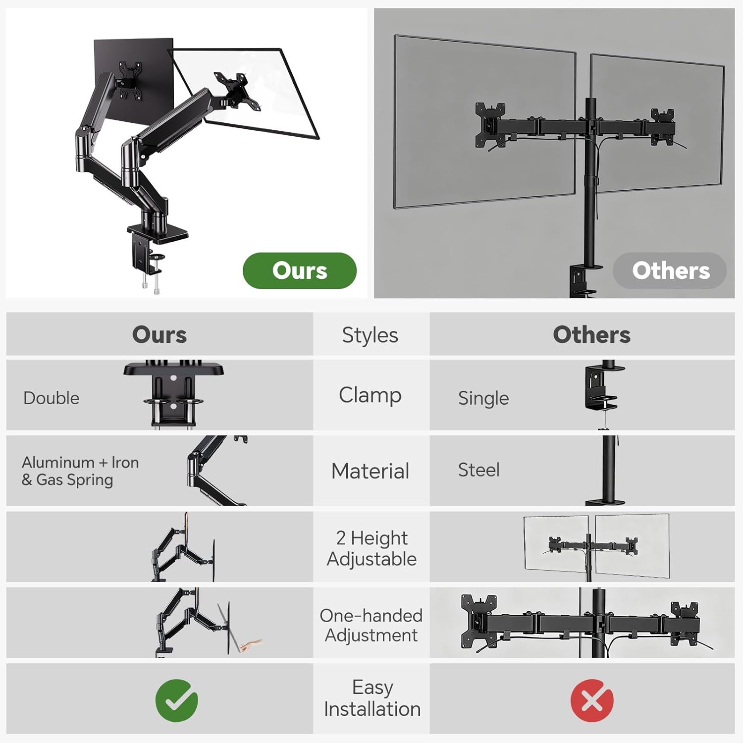 Rock Solid Stability for Dual 32″ Monitors: The Ekisemio dual monitor stand features reinforced zinc alloy joints and steel structure, providing stable support for 13-32 inch computer screens(19.8lbs each). The robust U-joint design eliminates screen wobble during typing or adjustments. Stress tested for day long stability during intense work sessions, it keeps monitors securely positioned while the durable build ensures long term reliability. Perfect for demanding professional use