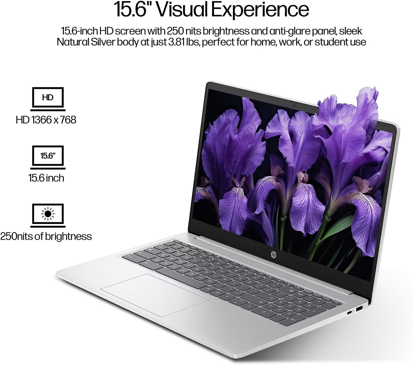 【Vibrant Display & Design】 15.6-inch HD screen with 250 nits brightness and anti-glare panel, sleek Natural Silver body at just 3.81 lbs, perfect for home, work, or student use