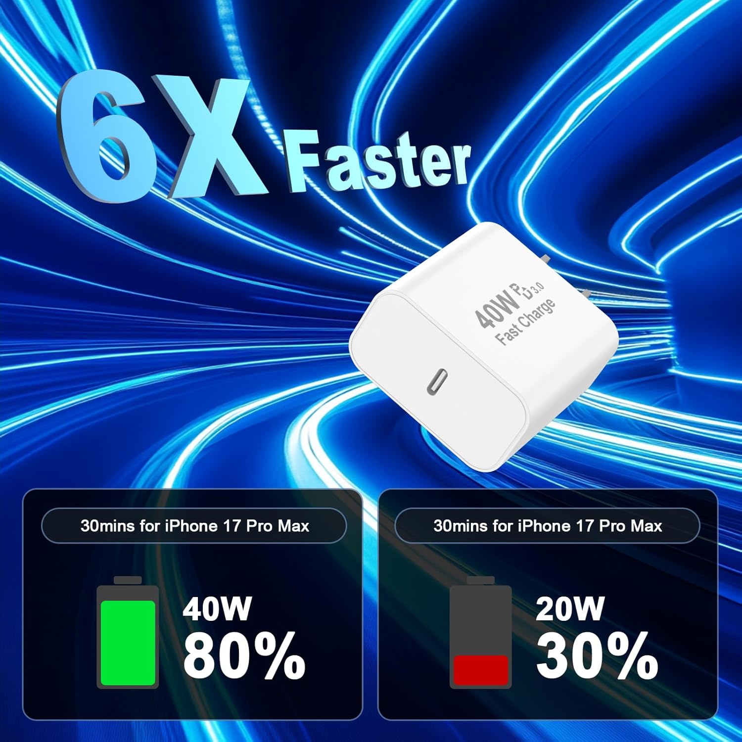【40W iPhone 17 Charger Fast Charging】 40W iPhone 17 Pro Max charger fast charging with 10ft type c charger cable cord enjoy a maximum output power of 40 watts, enabling fast charging for iPhone 17 16 15 Pro Max, fast charging your iPhone 17 Pro Max up to 50% within 20 minutes, 6X faster than the original 5W USB iPhone charger.