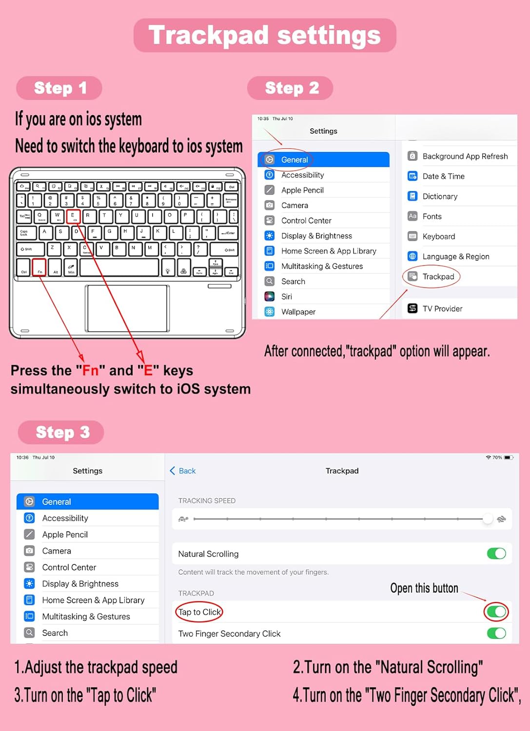 【Smart Touchpad, Supports Multi-touch】 The keyboard built-in smart touchpad, which has multi-touch function and supports 1 2 3 4 fingers Gestures . 1-fingers swipe can move the cursor, click to select the target, 2-fingers swipe can scroll the page and zoom the picture, 3-fingers swipe left and right can switch applications, and 4-fingers click can take a screenshot