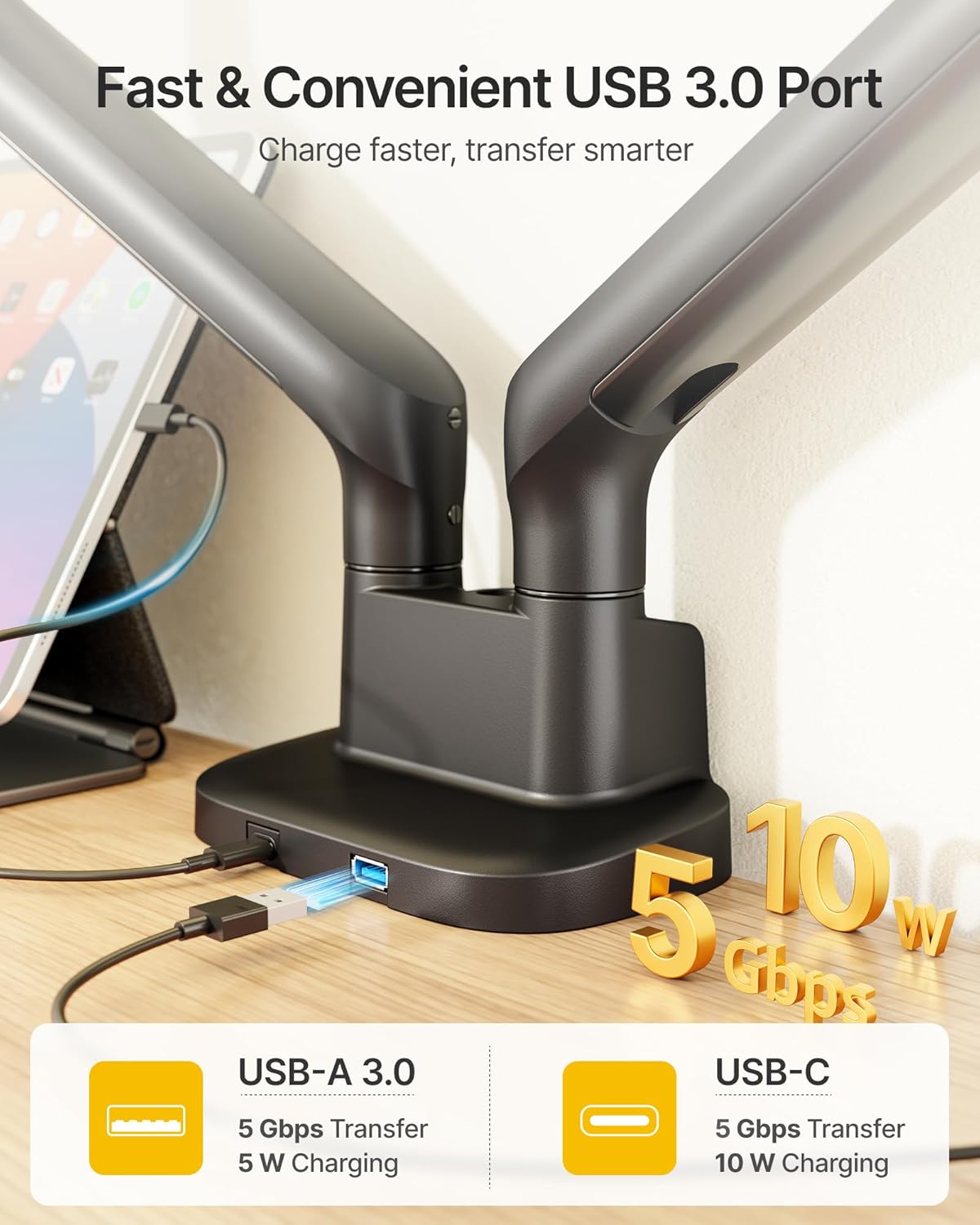 CLEAR DESKTOP SPACE WITH BUILT-IN USB HUB: Free up valuable workspace with the compact, low-profile base and elevated dual-arm design. The ultrawide-compatible arms lift both monitors off your desk, while the integrated cable management keeps cords hidden and organized. Dual built-in USB ports offer convenient charging for phones, gaming gear, or data transfer, keeping your setup sleek, spacious, and clutter-free.
