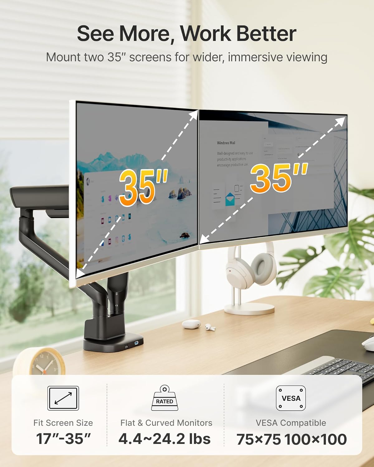 BROAD COMPATIBILITY FOR DUAL SCREENS: monTEK dual monitor arm fits most 17″–35″ flat or curved screens, supporting up to 24.2 lbs per arm for stable and reliable performance. Fully compliant with VESA 75×75mm and 100×100mm standards. Ideal for office workstations, home setups, and gaming rigs, this dual monitor mount adapts easily to a wide range of setups and screen types.