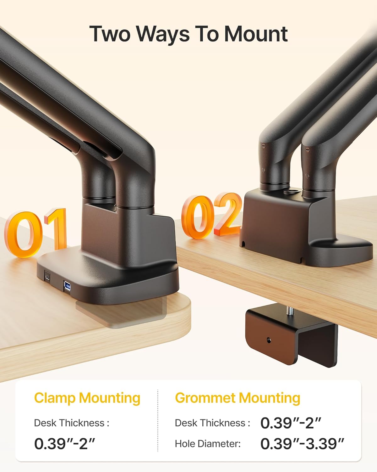 This dual monitor arm feels well built and supports larger screens securely. Mechanical spring adjustment allows smooth positioning and easy height changes. The integrated USB port adds convenience for desk setups. Mounting options are flexible with both clamp and grommet included. Once installed, the arms hold position without sagging. Cable management helps keep the workspace tidy. Overall, it is a solid upgrade for improving desk ergonomics. Worth the cost for the quality and features included.