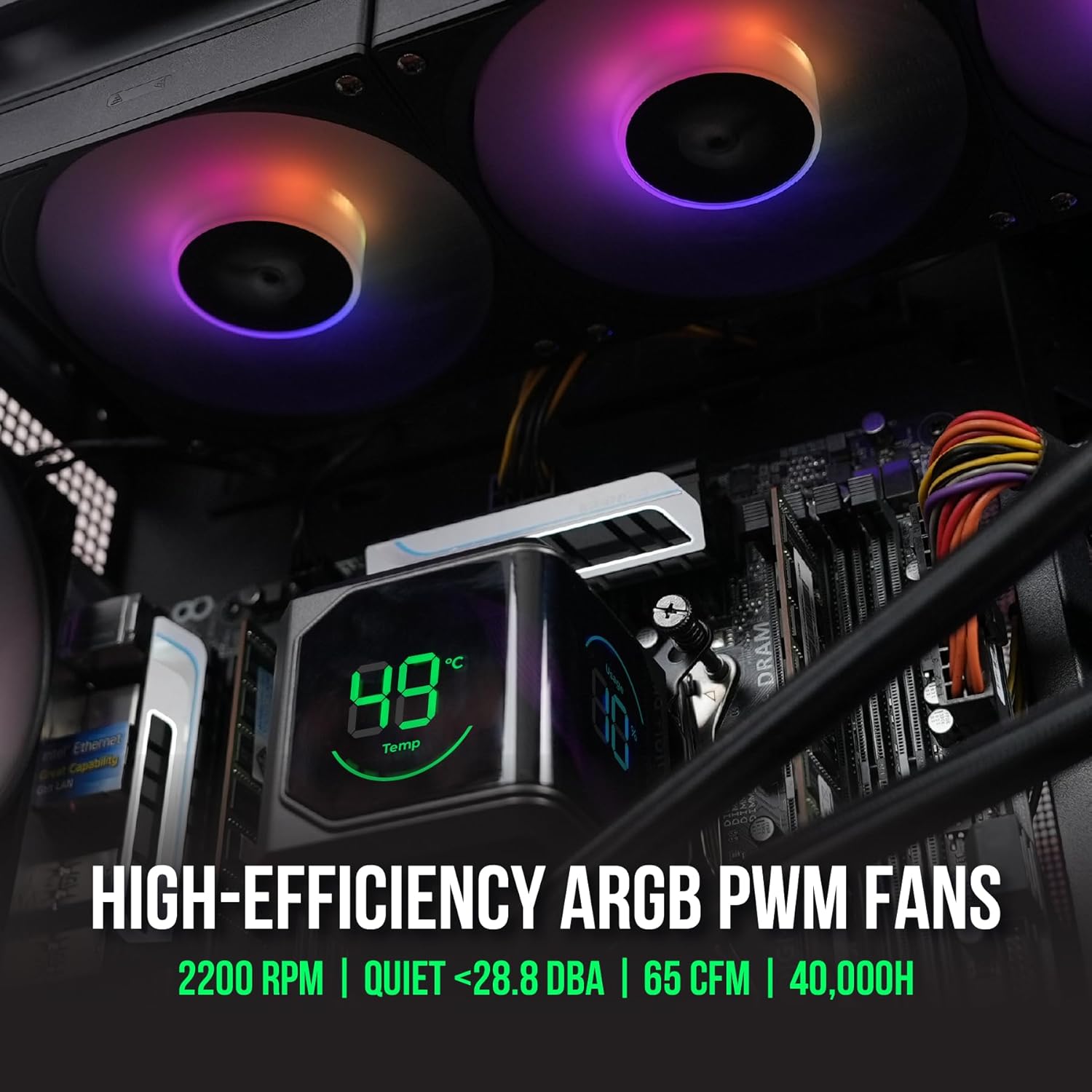 HIGH-EFFICIENCY ARGB PWM FANS – Equipped with dual 120×120×25mm PWM ARGB fans operating from 500–2200 RPM while keeping noise below 28.8 dBA. They deliver up to 65 CFM of airflow with hydraulic bearings for quiet, long-lasting performance rated for 40,000 hours. Fan and RGB cables are aligned side-by-side for cleaner, more intuitive cable management.