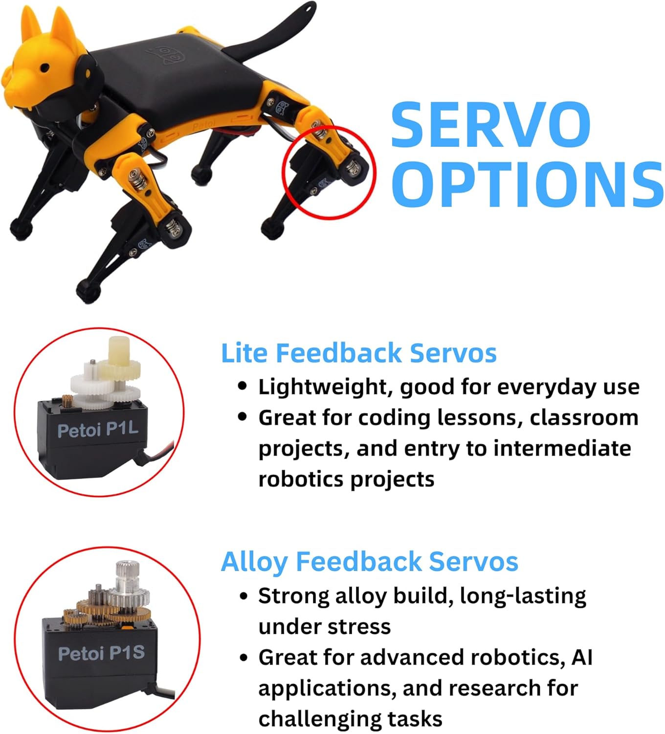 Program AI for Robot Dog that Acts Like a Real Dog: Program your robotic dog to see, hear, and sense the environment with optional sensors. Now upgraded with feedback servos for smarter, real-dog-like navigation and realistic robotic dog behaviors