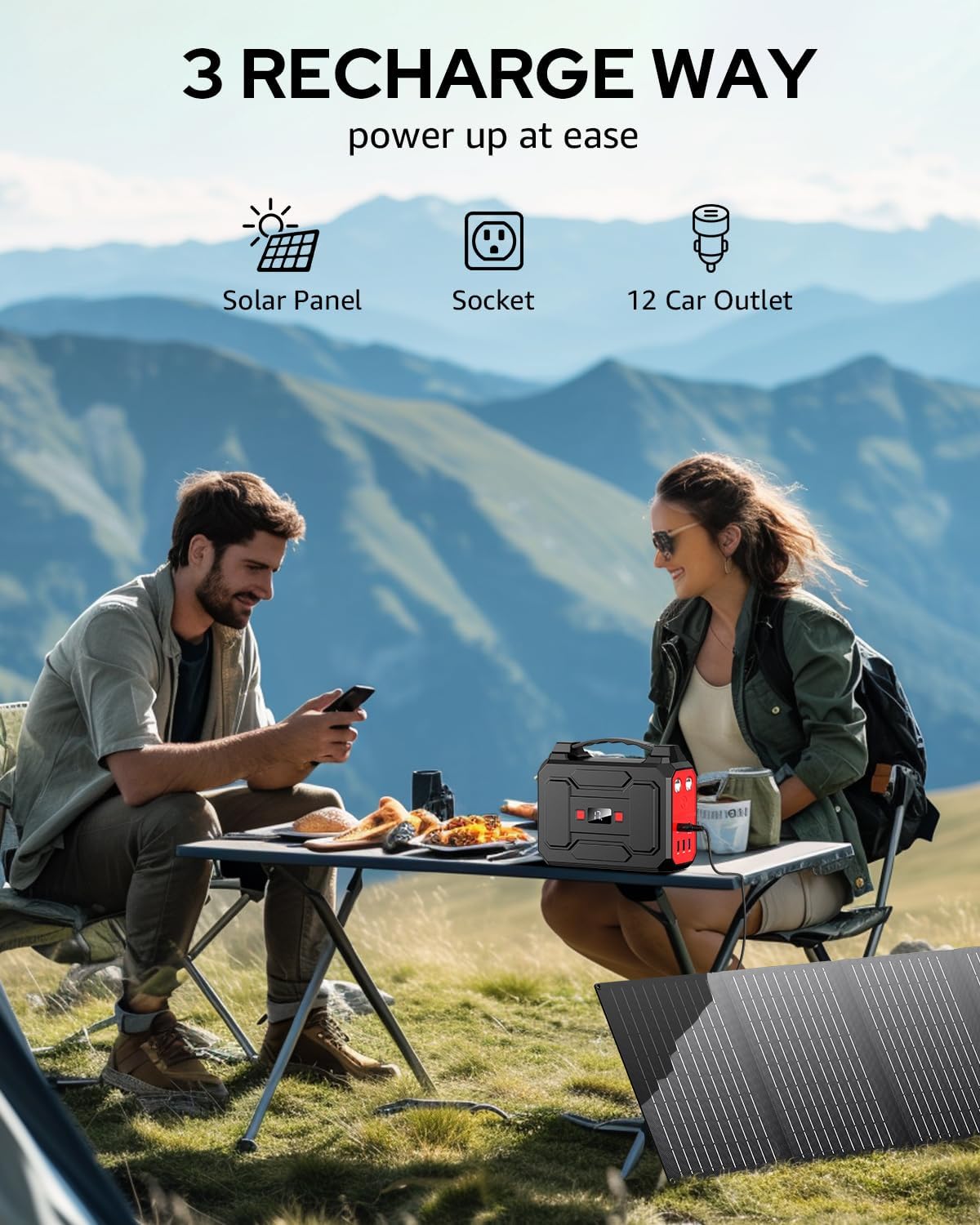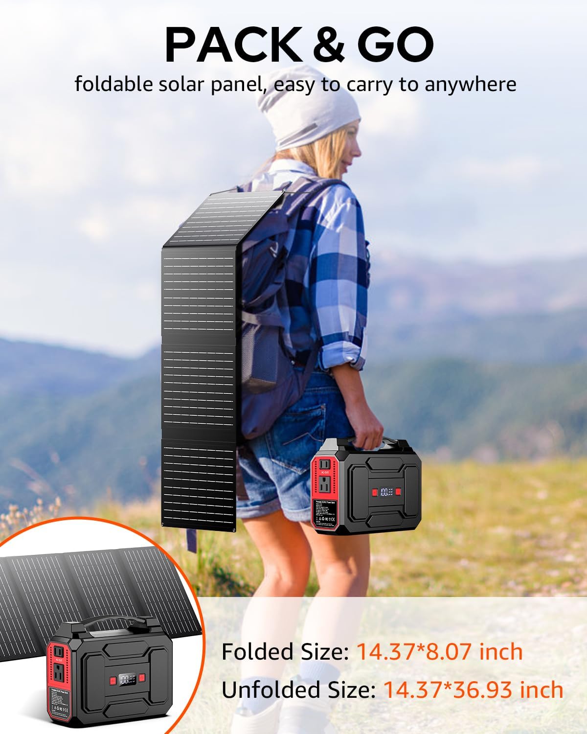 PORTABLE POWER STATION WITH LARGE CAPACITY: This portable power station with solar panel 146Wh/39600mAh is powerful enough to charge your devices like laptops, phones, tablets, cameras, drones, fans, in-car appliances. Portable Power Station weights only 3.3lb, fits perfectly in backpack or suitcase, making it a great portable power station for camping, hurricanes, emergency, home and outdoor activities.
